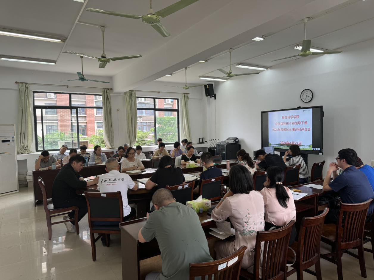 4月23日,乐天使fun88登录入口在至善楼409会议室举行中层领导班子和领导干部2023年考核民主测评与评议会,继续教育学院管理岗五级组织员李华明到会指导,学院党委书记韦焕贤主持会议,全院教职工参会。