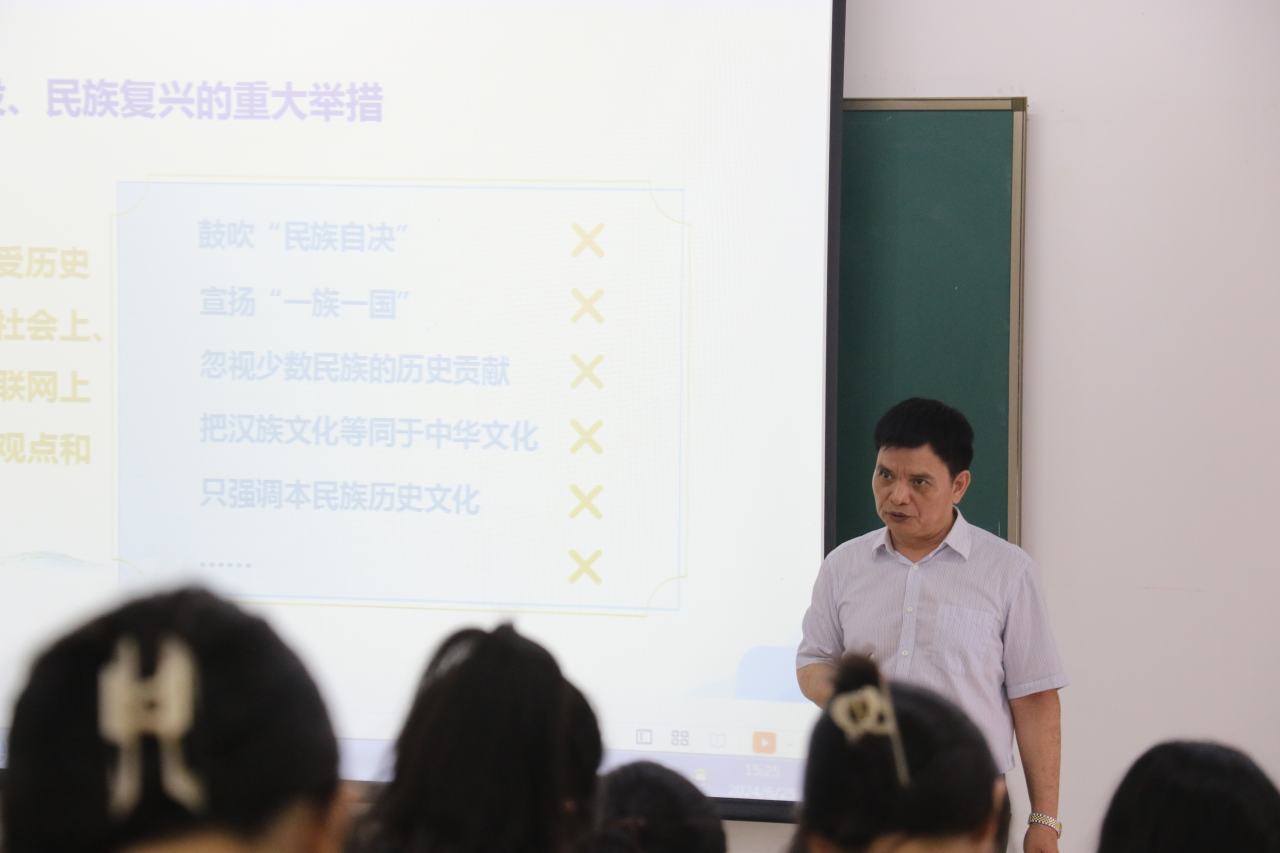 本次讲座从铸牢中华民族共同体的战略意义,把握中华民族共同体意识的丰富内涵,铸牢中华民族共同体意识的实践路径等方面内容展开,同时结合视频进行宣讲,讲座内容丰富,图文并茂,深入浅出。韦焕贤书记强调,新时代青年铸牢中华民族共同体意识应从全面推进中华民族共有精神家园建设、推动各民族共同走向社会主义现代化、促进各民族广泛交往交流交融等五方面实践。最后以同心共筑中国梦视频作为本次讲座的结尾,呼吁同学们把“小我”融入“大我”携手共筑中华民族伟大复兴中国梦。