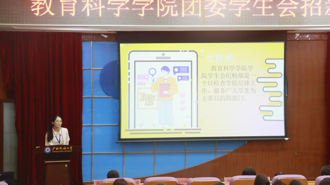随后,各部门负责人逐一宣讲各部门职责、特色活动以及招新的具体要求,期望新生们能够踊跃加入教科大家庭,积极投身于院团委学生会的工作中,通过实践锻炼,提升个人的组织协调力、沟通力及团队协作力,共同为院团委学生会的蓬勃发展贡献智慧与力量。