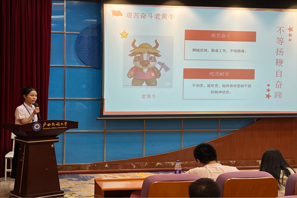 陈菊姝同学主要分享“三牛精神”。她结合身边的案例,为同学们详细讲解“三牛精神”的具体含义。具体结合广西柳州江门村驻村书记杨宁的工作故事,深刻解读为人服务的“孺子牛精神”。她提到杨宁书记在她的工作中始终全心全意为人民服务,将百姓的幸福生活放在首位。最后,在互动提问环节,同学们探讨“作为青年学生的我们该如何在生活中发扬和实践三牛精神?”。同学们表示今后要注重提升个人分析解决实际问题的实践能力,在校期间可以通过社会实践等志愿服务形式的,增强服务祖国和人民的社会责任感,真正成长为担当中华民族伟大复兴大任的时代新人。