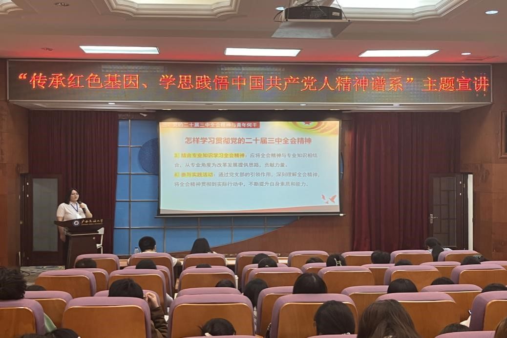 活动伊始,王昱然同学以“深入学习贯彻党的二十届三中全会精神”为主题,通过分析横州茉莉花产业的发展案例,深入浅出地为同学们讲解“新质生产力与高质量发展”的关系,引导同学们理解什么是“新质生产力”。王昱然还对新时代青年该如何学习贯彻党的二十届三中全会精神做了分享:第一要准确深入领悟全会的精神核心要义,第二则是要结合自身专业来学习全会精神,将全会精神运用到个人的社会实践中。