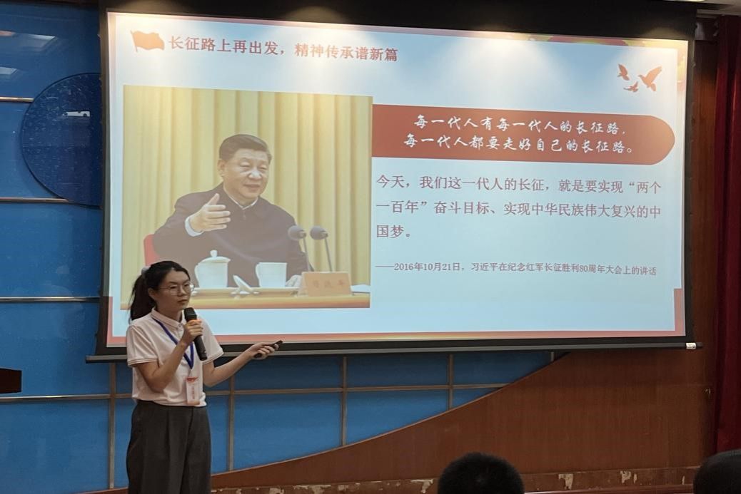 分享会最后,杨林玮同学以“长征路上再出发,精神传承谱新篇”为题继续开展宣讲。她用湘江战役中陈树湘师长的英勇事迹分享长征路上的感人故事,生动地讲述了长征精神的内容,帮助同学们理解好长征精神的内涵。她提到在如今百年之未有大变局中,长征精神始终照亮着我们前行的道路,为我们提供强大的精神支撑和信仰力量。作为新时代的青年,我们要将自身与实现伟大复兴的中国梦结合,走好自己的“长征路”。