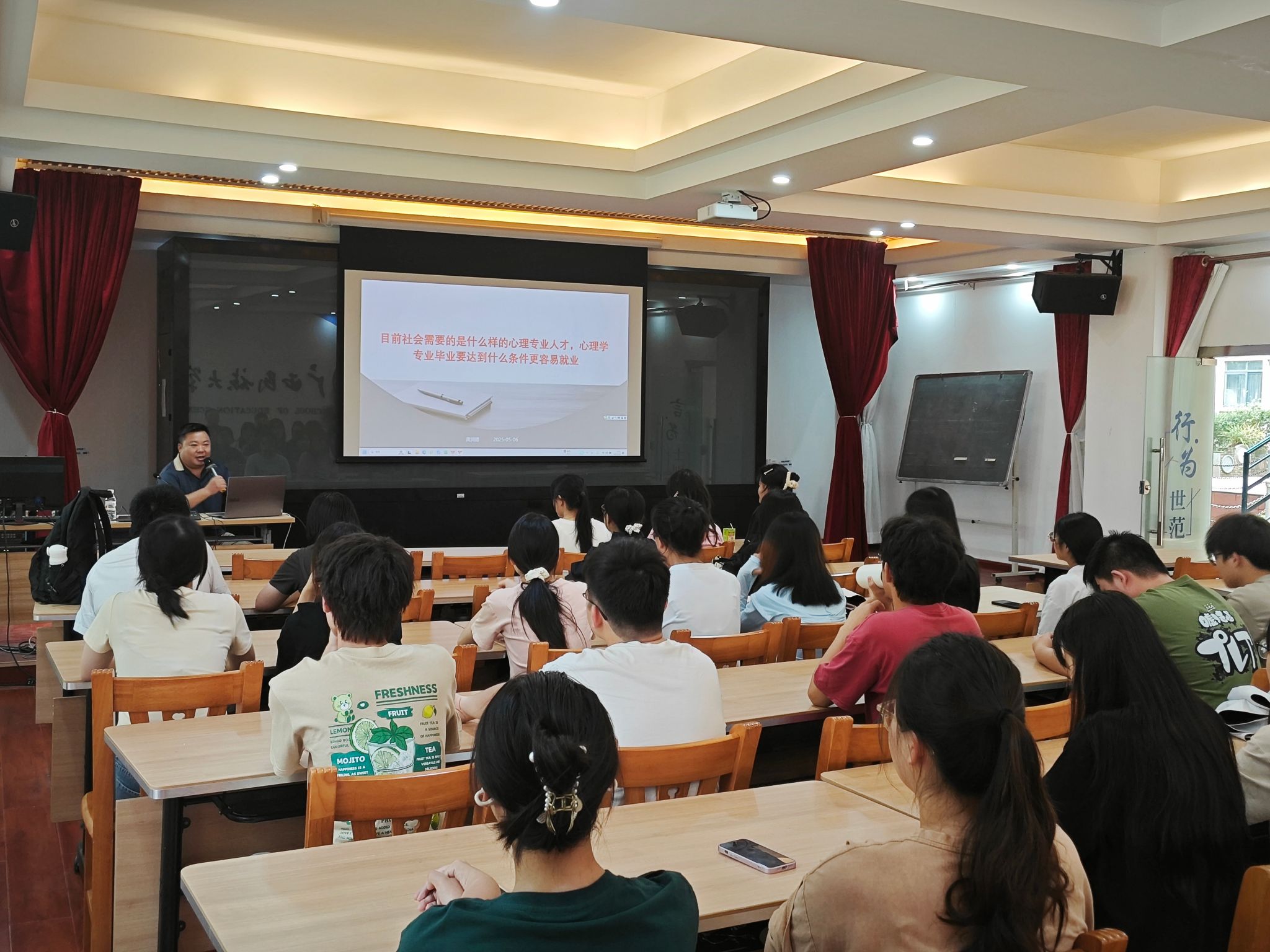 活动中,龚润德老师结合自身丰富的求学及工作经历,深入浅出地剖析了应用心理专业的毕业要求和条件。他以生动的案例、详实的数据,为学生们勾勒出该专业在当下就业市场中的全景图,让学生们对自己未来的职业道路有了更为清晰的认知。龚老师强调,应用心理专业不仅需要扎实的理论基础,更要注重实践能力的培养,鼓励学生们积极参与实习、实践项目,积累经验,提升自身竞争力。